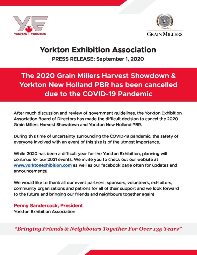 The 2020 Yorkton Exhibition Summer Fair & Outdoor Rodeohas been cancelled due to the COVID-19 PandemicIt is withgreat regret that the Yorkton Exhibition Association must announce the cancellation ofthe 2020 Summer Fair & Outdoor Rodeo.