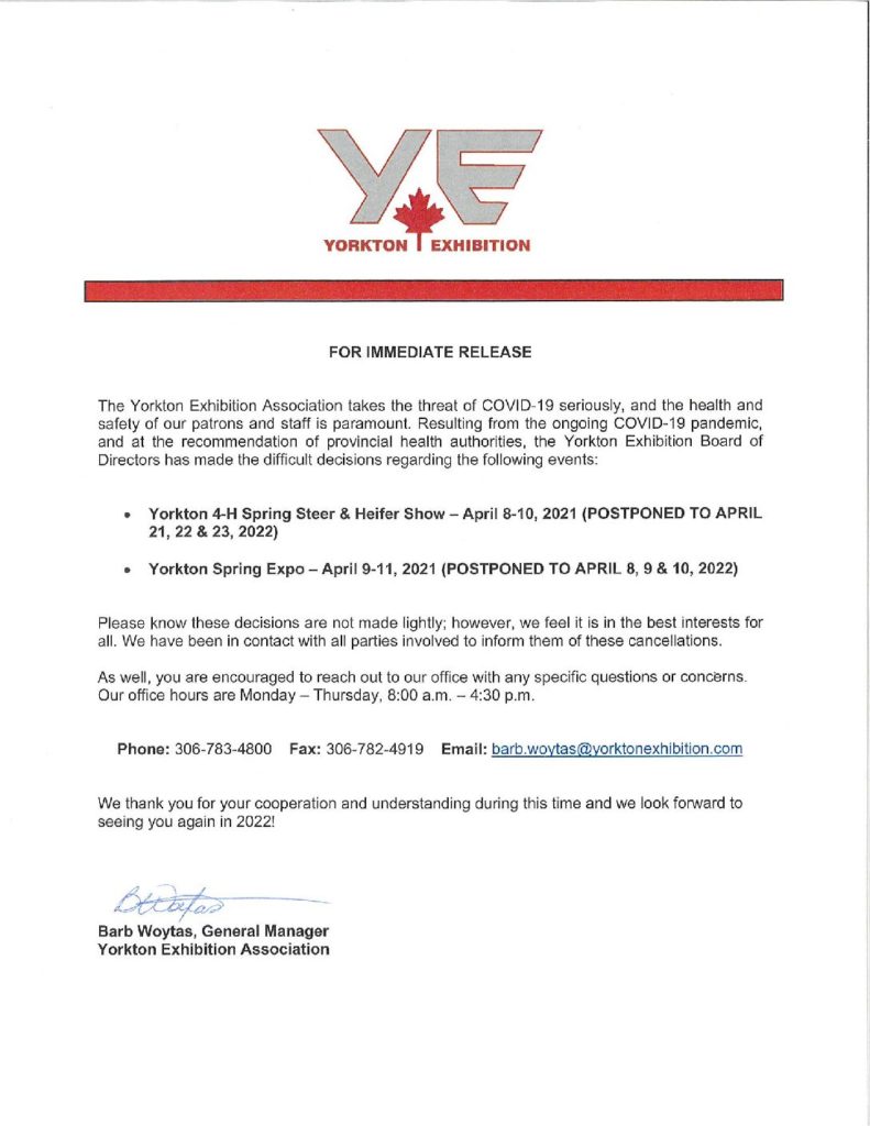 The 2021 4-H Spring Steer & Heifer Show & Yorkton Spring Expo has been cancelled due to the COVID-19 Pandemic