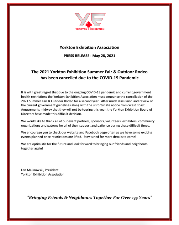 The 2020 Yorkton Exhibition Summer Fair & Outdoor Rodeohas been cancelled due to the COVID-19 PandemicIt is withgreat regret that the Yorkton Exhibition Association must announce the cancellation ofthe 2020 Summer Fair & Outdoor Rodeo.