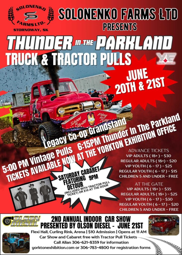 The action doesn’t stop at the track! Saturday night at 9 PM, get ready to party at the Cabaret featuring DETOUR, included with your Tractor Pull ticket or just $10 at the door. Plus, don’t miss the 2nd Annual Indoor Car Show presented by Olson Diesel on June 21st at Flexi Hall & Curling Rink Arena, featuring stunning classic and custom rides. Whether you’re a motorsport enthusiast or just looking for a fun weekend out, Thunder in the Parkland is the ultimate event for the whole family!